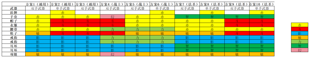 适用魔导士/圣职者。跟上述方案3对比,把双手武器换成了单手武器+赤盾,效果同上述,大幅增加坦度,并多激活一条赤套装属性,弥补PVE输出以及生存能力。适用迷宫乱斗、屠魔战场等PVEPVP结合性玩法。